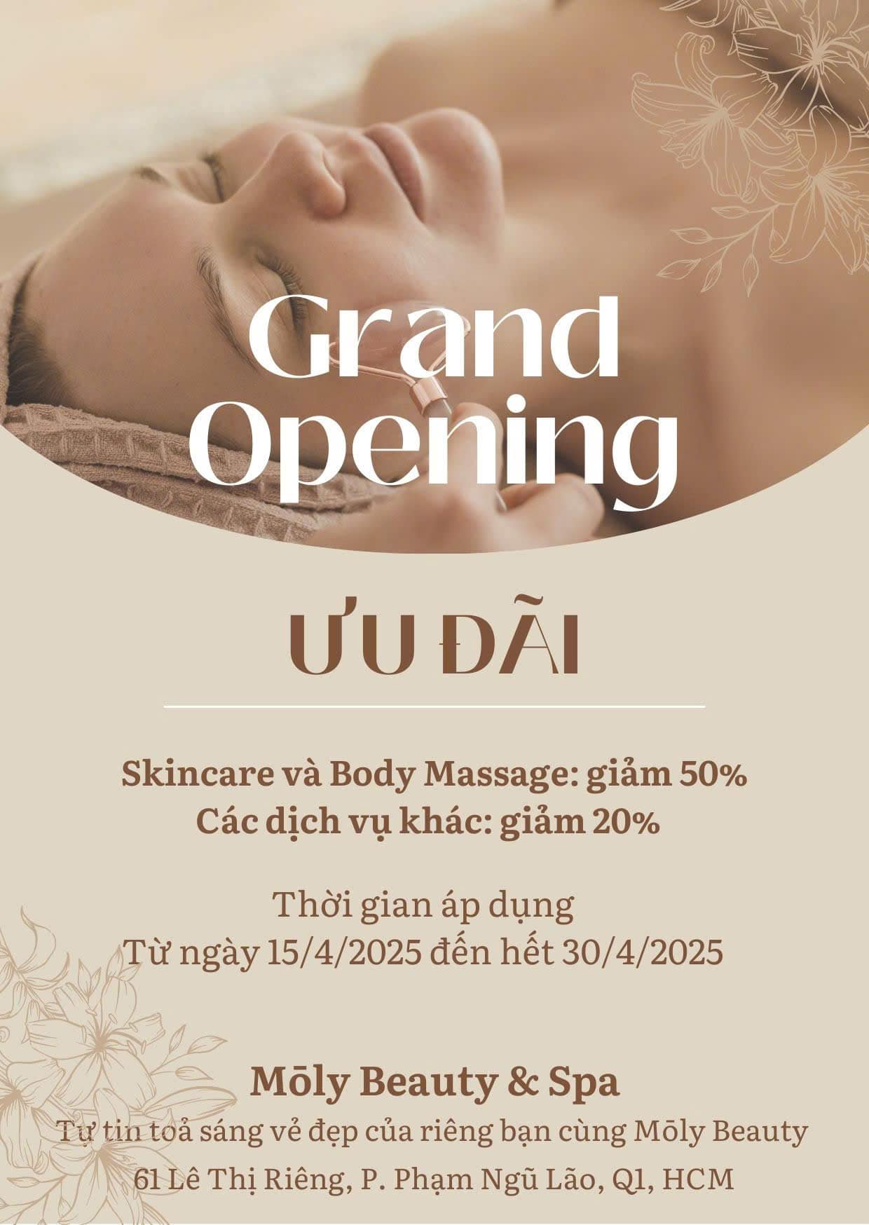 Hãy đến và trải nghiệm dịch vụ cấp cao tại Mōly Beauty & Spa trong những dịp khai trương tài khoản này! Chúng tôi rất hân hạnh được đồng hành cùng bạn trên hành trình chăm sóc sắc đẹp và sức khỏe.